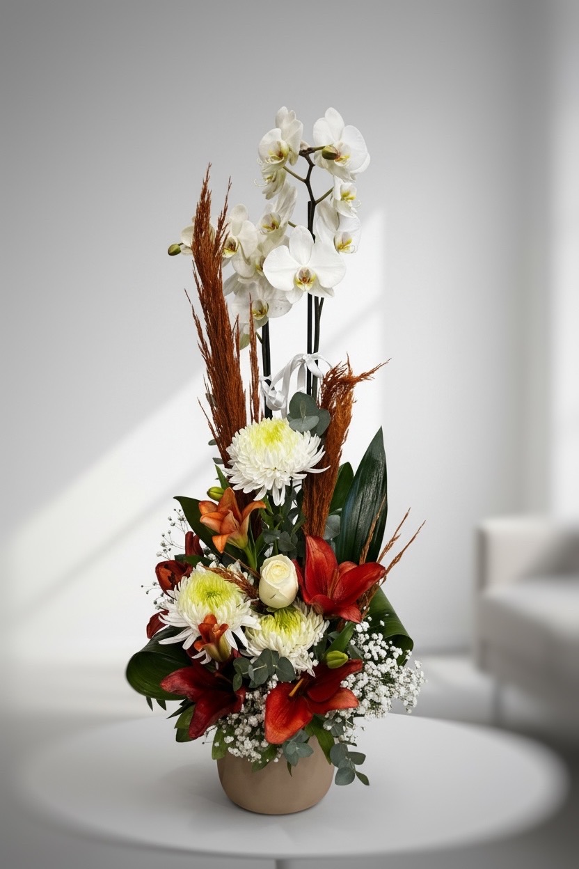 Her bir çiçek özenle seçilmiş, tazeliği ve canlılığı garanti edilmiş olup, deneyimli çiçekçilerimizin elinden çıkan bu aranjman, görsel bir şölen sunmaktadır. Beyaz orkidelerin narin yaprakları ve asil duruşu, kırmızı lilyumların cesur renkleriyle birleşerek hem sakinliği hem de dinamizmi bir arada yaşatır. Bu aranjman, her ortama uyum sağlayacak şekilde tasarlanmıştır ve uzun süre tazeliğini koruyarak güzelliğini sergilemeye devam eder.
