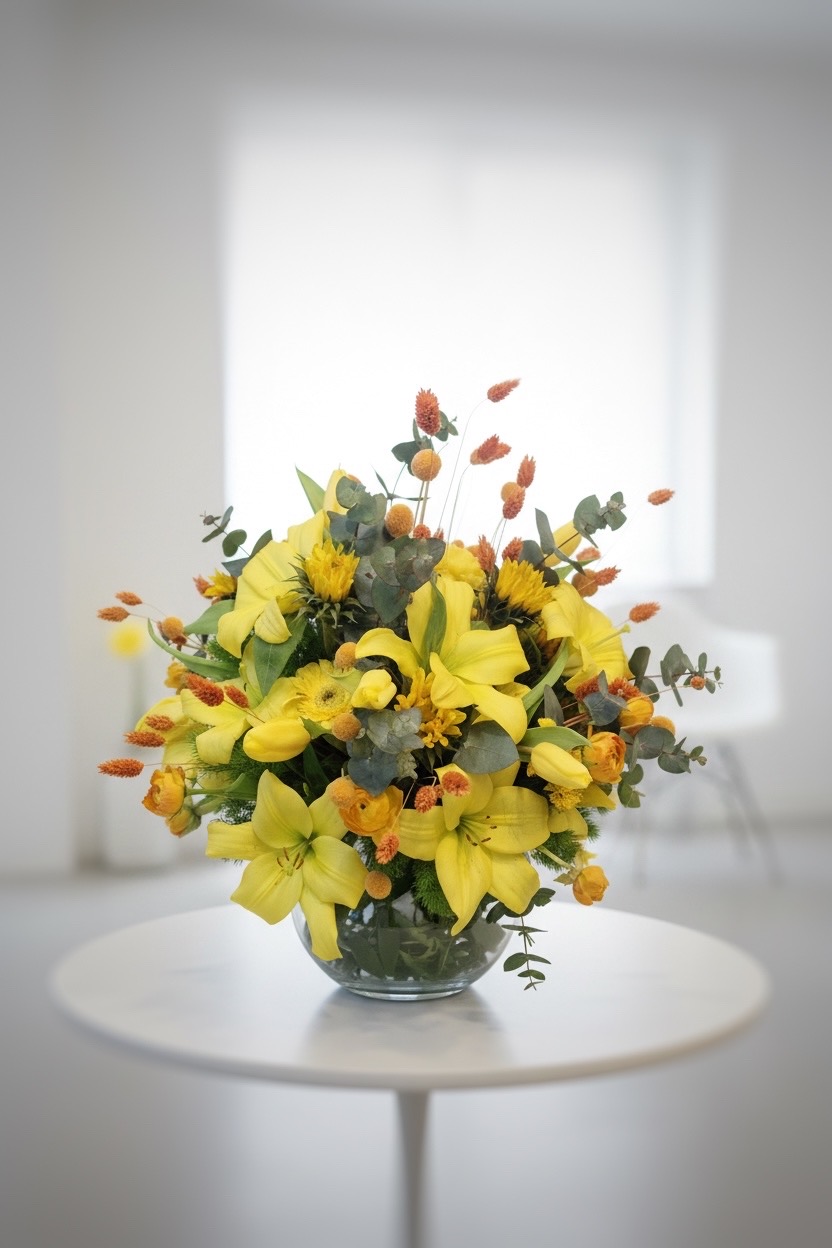 - Tazelik ve Canlılık: Sadece en taze ve en güzel sarı lilyumlar ve gerberalar kullanılmıştır.
