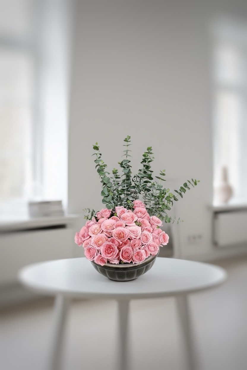 Bu özel aranjman, sadece bir çiçek buketi değil, aynı zamanda sanatsal bir tasarımdır. Kaliteli seramik saksısı, pembe güllerin nazik tonlarını ve okaliptüsün ferahlatıcı yeşilini kusursuz bir şekilde tamamlar. Hem göz alıcı hem de stil sahibi bir hediye arayanlar için idealdir.